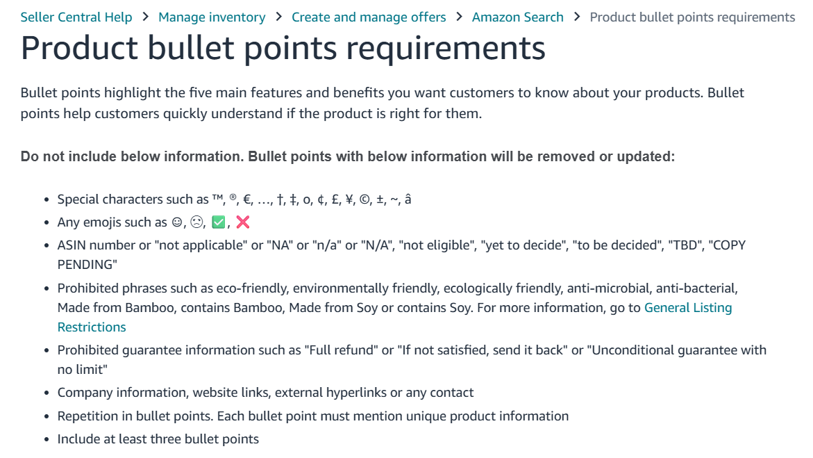 Most categories allow up to five bullet points. Always use the maximum allowed for your category to maximize keyword indexing and information delivery.